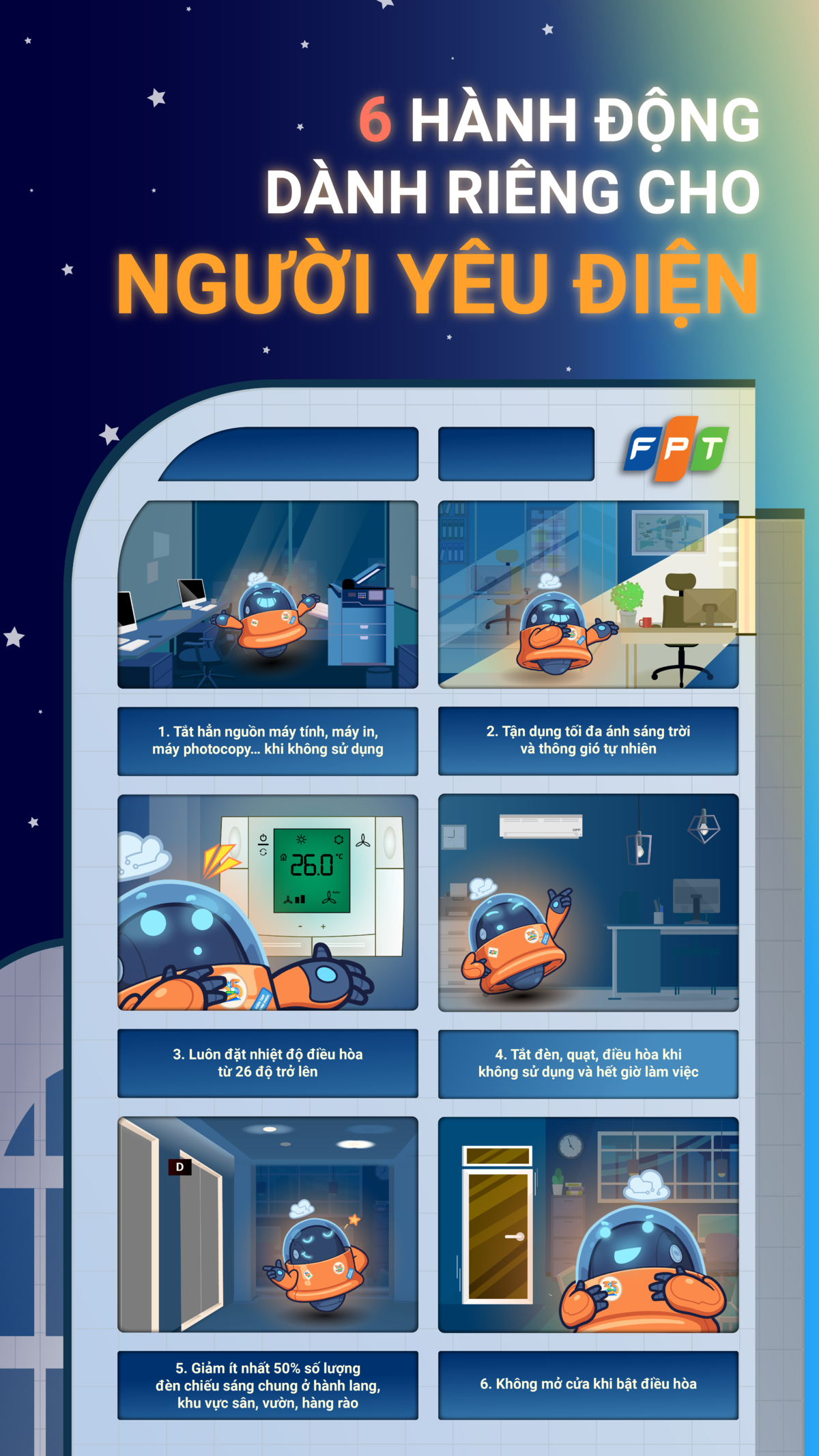 Một trong những điểm nhấn của chiến lược tiết kiệm năng lượng tại FPT là xây dựng thói quen sử dụng điện có trách nhiệm. Việc tắt đèn, điều hòa, máy tính và các thiết bị điện sau giờ làm việc hoặc trong giờ nghỉ trưa được xem là hành động cơ bản nhưng mang lại hiệu quả tích lũy lớn. Khi áp dụng trên quy mô hàng chục nghìn nhân sự, lượng điện tiết kiệm có thể tương đương mức tiêu thụ của nhiều tòa nhà thương mại trong một năm.