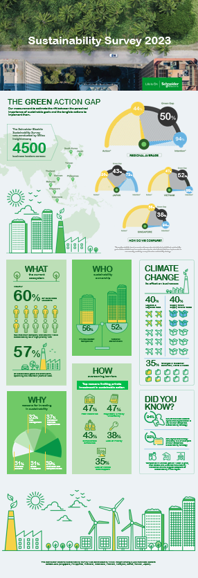 Để đo lường sự chênh lệch này, Schneider Electric đưa ra chỉ số Green Action Gap, tạm dịch là “Khoảng cách Xanh”. Chỉ số phản ánh khoảng cách giữa tỷ lệ doanh nghiệp đặt mục tiêu bền vững và tỷ lệ doanh nghiệp triển khai kế hoạch cụ thể. Ở quy mô khu vực, Green Action Gap ở mức 50%, cho thấy dù 94% doanh nghiệp đã thiết lập mục tiêu nhưng chỉ 44% có kế hoạch triển khai rõ ràng.