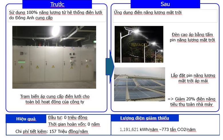 Trên nền tảng đó, nhiều giải pháp kỹ thuật được triển khai đồng thời, từ việc thay thế hệ thống chiếu sáng bằng đèn tiết kiệm điện đến lắp đặt cảm biến tự động cho các khu vực sử dụng năng lượng lớn. Các dây chuyền sản xuất cũng được điều chỉnh nhằm rút ngắn thời gian vận hành và tăng hiệu suất thiết bị. Việc đầu tư hệ thống điện mặt trời áp mái từ năm 2024 cho thấy bước chuyển rõ rệt trong việc giảm phụ thuộc vào nguồn điện truyền thống, đồng thời góp phần cắt giảm phát thải trong sản xuất.