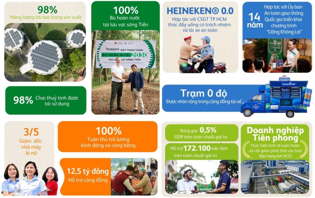 Doanh nghiệp cũng tiếp tục củng cố mô hình kinh tế tuần hoàn bằng cách duy trì tỷ lệ tái sử dụng 98 phần trăm chai thủy tinh và 94 phần trăm két nhựa. Tất cả nhà máy của Heineken Việt Nam đều đạt mục tiêu không rác thải chôn lấp.