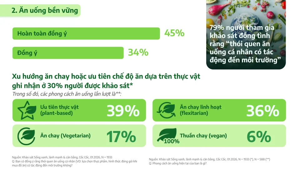 Trong bối cảnh các vấn đề môi trường, sức khỏe và chất lượng sống ngày càng trở thành mối quan tâm trung tâm của xã hội, lối sống xanh, lành mạnh và cân bằng không còn là một xu hướng mang tính ngắn hạn mà đang dần trở thành một hệ giá trị mới chi phối hành vi tiêu dùng. Dữ liệu từ báo cáo của Cốc Cốc cho thấy sự chuyển dịch này diễn ra trên diện rộng, khi phần lớn người tiêu dùng không chỉ nhận thức rõ về các vấn đề liên quan đến môi trường và sức khỏe mà còn bắt đầu điều chỉnh thói quen sống và lựa chọn sản phẩm theo hướng có trách nhiệm hơn.