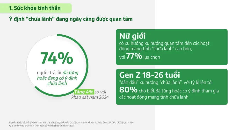 Không chỉ dừng lại ở sức khỏe thể chất, sức khỏe tinh thần cũng đang trở thành một yếu tố quan trọng trong hệ giá trị tiêu dùng mới. Dữ liệu khảo sát cho thấy phần lớn người tiêu dùng đánh giá cao vai trò của sức khỏe tinh thần và có xu hướng tìm kiếm các hoạt động giúp cân bằng cảm xúc. Đáng chú ý, nhu cầu này không còn mang tính phản ứng trước áp lực mà đang chuyển sang hướng chủ động, khi người tiêu dùng tìm kiếm các giải pháp duy trì trạng thái cân bằng trong dài hạn.