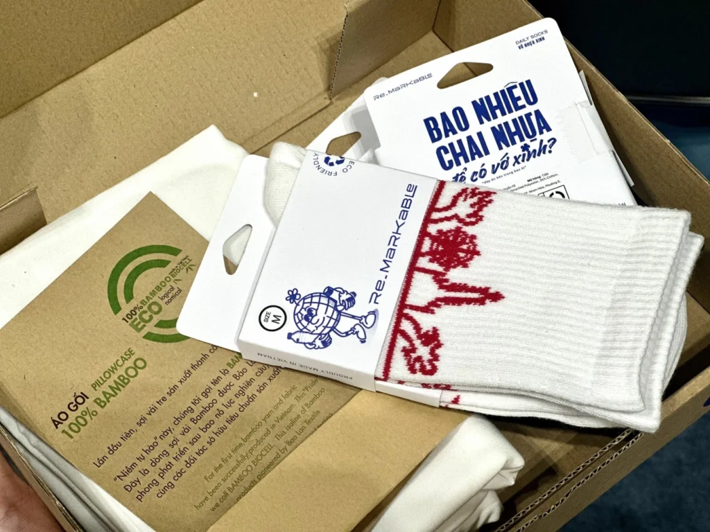 Tất làm từ nhựa tái chế và áp gối từ sợi tre được sản xuất ở Việt Nam. Ảnh: Viễn Thông