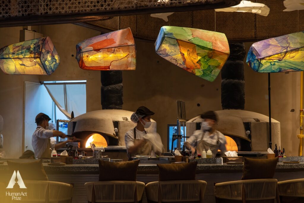 Không chỉ dừng ở phân loại rác, Pizza 4P’s đã biến toàn bộ không gian nhà hàng thành một hệ sinh thái tuần hoàn. Ghế ngồi từ nhựa tái chế, gạch tái chế ốp tường, thép cũ làm tay vịn… Tất cả đều chứng minh cho triết lý biến “rác thải” thành “tài nguyên”.