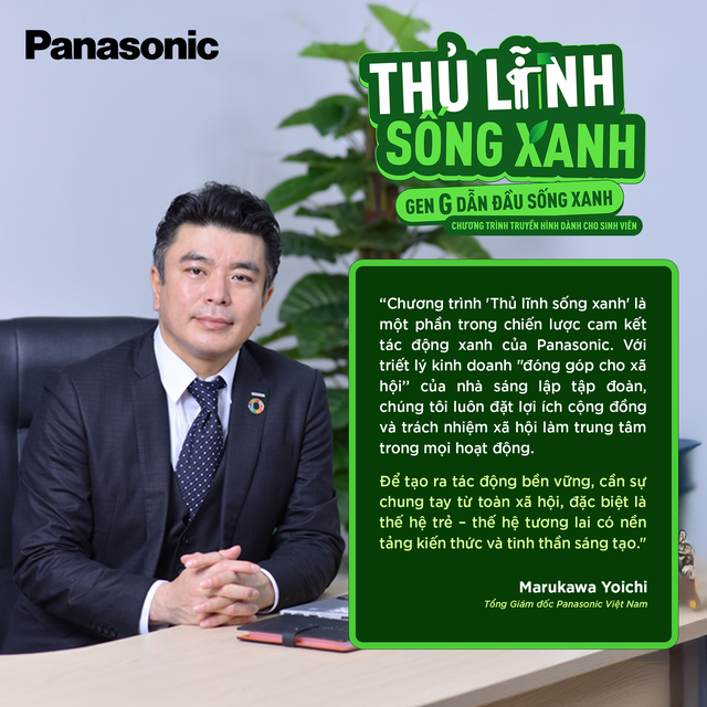 Chương trình truyền hình thực tế Thủ lĩnh sống xanh do Đài Truyền hình Việt Nam phối hợp cùng Panasonic sản xuất đã khép lại sau nhiều tuần phát sóng. Đây là hoạt động thuộc chiến dịch Dẫn đầu sống xanh mở tương lai bền vững, nằm trong khuôn khổ cam kết toàn cầu Panasonic Green Impact hướng đến mục tiêu giảm ba trăm triệu tấn khí thải carbon vào năm 2050 và đạt phát thải ròng bằng không vào năm 2030.